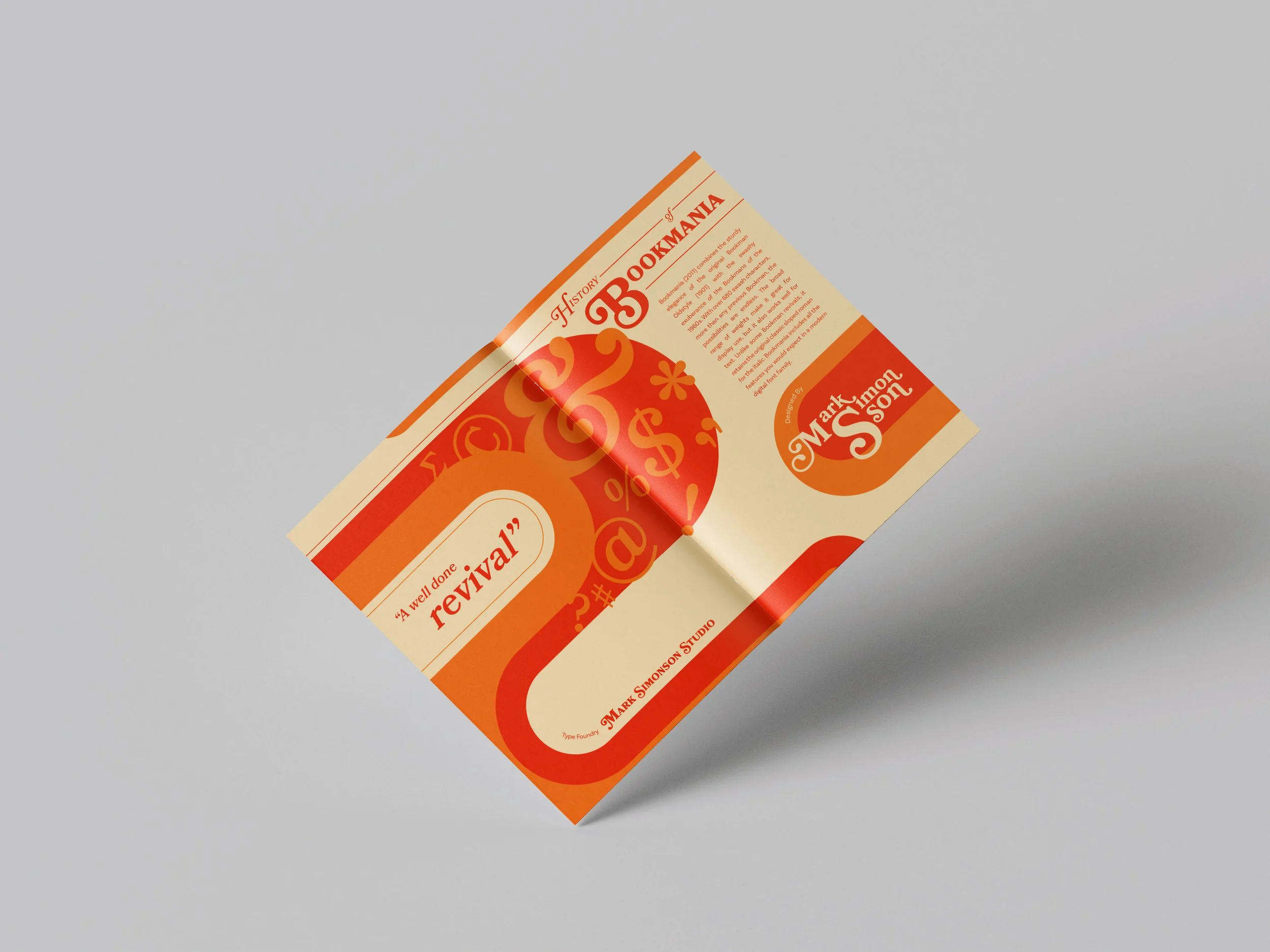 I designed a brochure about the history, traits, and visuals of the Bookmania typeface. Inspired by the vintage origins of Bookmania and the curvy nature of the typeface, I designed the brochure utilizing the classic 70’s appeal and unique glyphs.